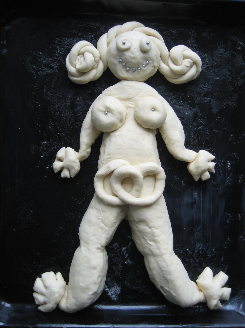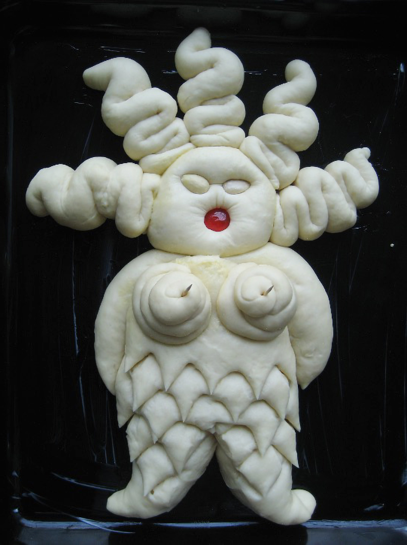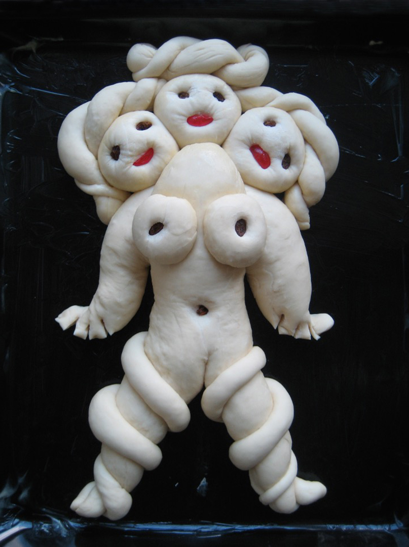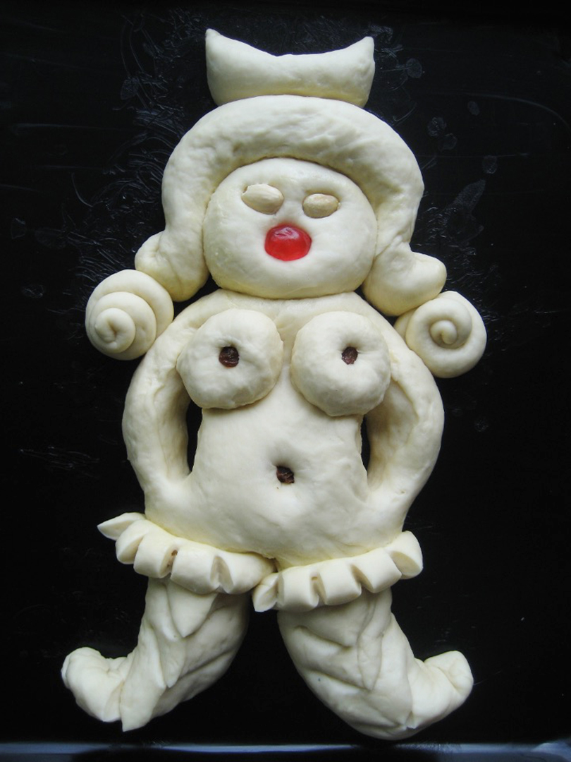 Dedications è una performance lunga un anno: un ritorno alle origini, un gesto quotidiano che diventa rito. Pane al latte modellato a mano, senza progetto, seguendo solo l’istinto: la pasta che lievita, si espande, si lascia tagliare e plasmare fino a diventare corpo femminile. Occhi di mandorla, bocche di ciliegie candite, segni d’uva sultanina. Figure nate dal calore della terra e restituite al calore del forno.