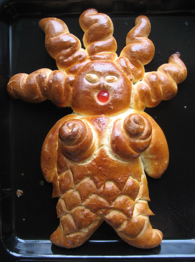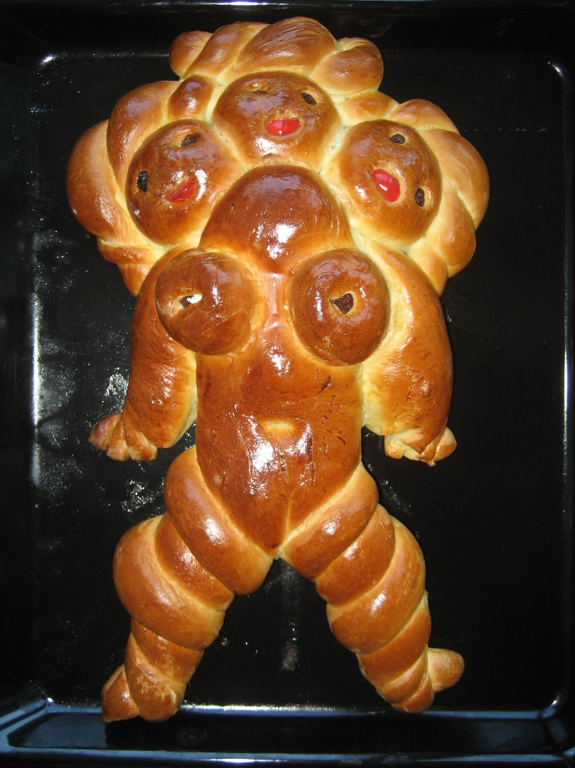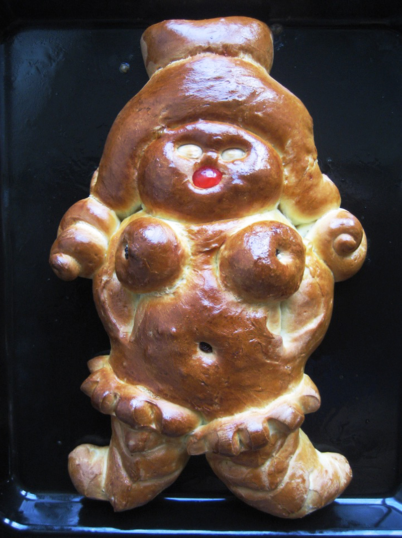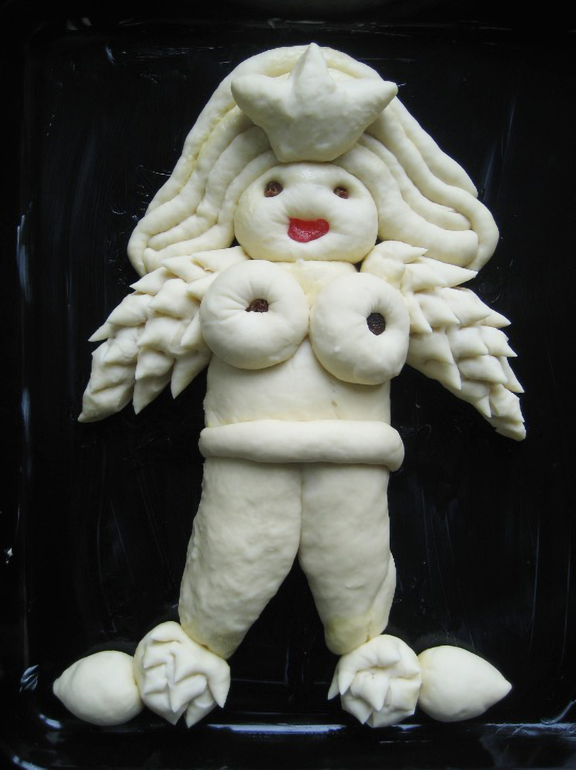 Dedications è una performance lunga un anno: un ritorno alle origini, un gesto quotidiano che diventa rito. Pane al latte modellato a mano, senza progetto, seguendo solo l’istinto: la pasta che lievita, si espande, si lascia tagliare e plasmare fino a diventare corpo femminile. Occhi di mandorla, bocche di ciliegie candite, segni d’uva sultanina. Figure nate dal calore della terra e restituite al calore del forno.