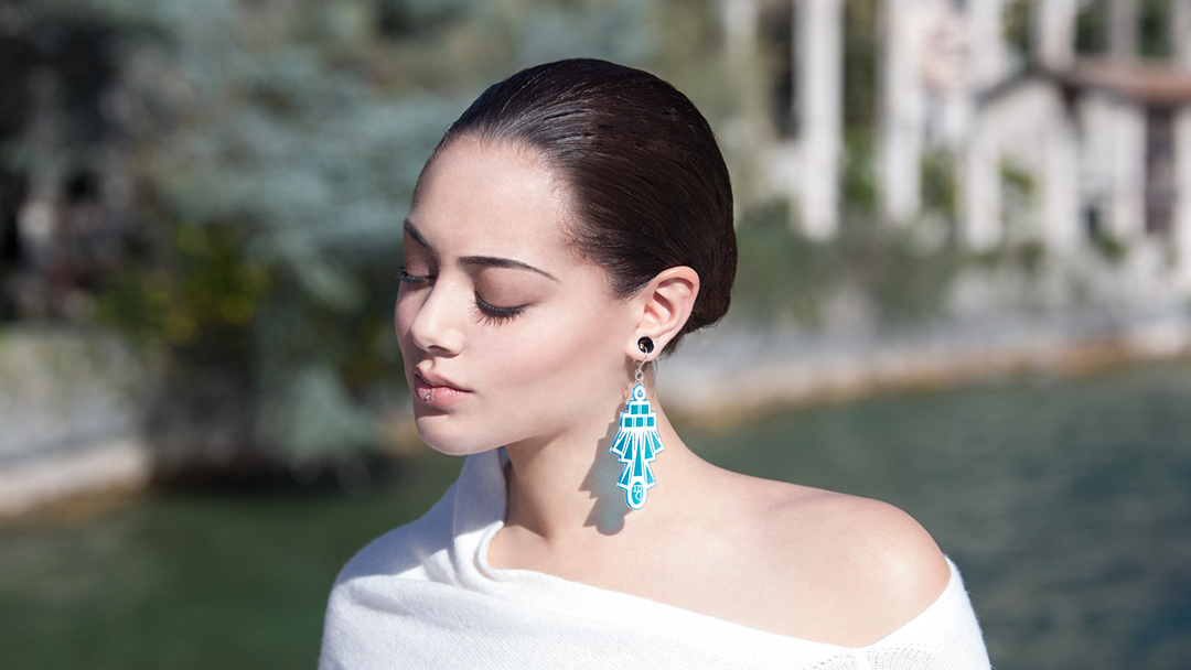 - orecchini in PETG, materiale trasparente che, attraverso il colore, evoca rubini, smeraldi e zaffiri in una versione contemporanea e leggera,