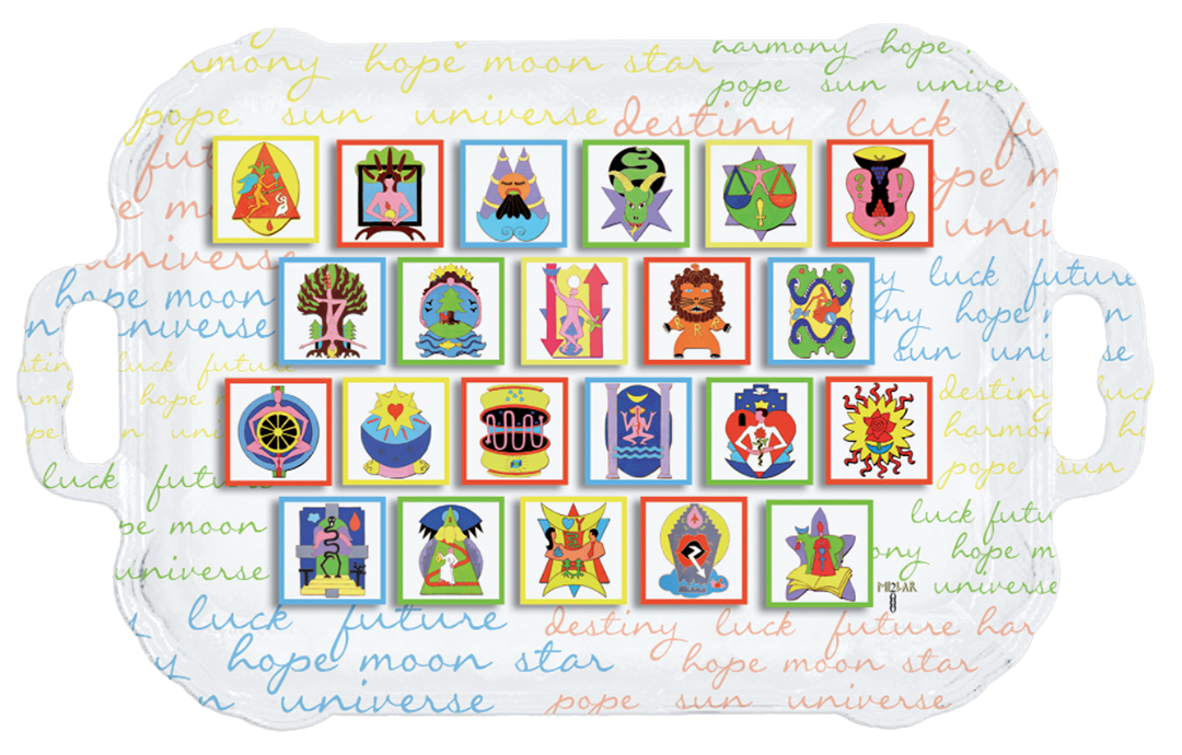 Il viaggio inizia con le carte dei Tarocchi, che diventano set americani in plexiglass e vassoi in melanina: simboli rituali si trasformano in gesti domestici, superfici che accompagnano il quotidiano con un’aura di significato.
