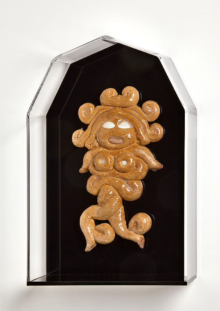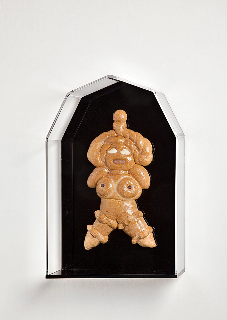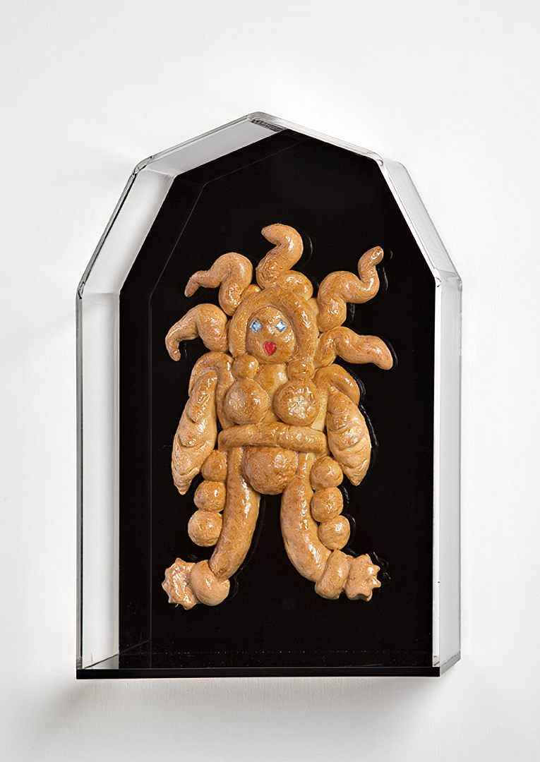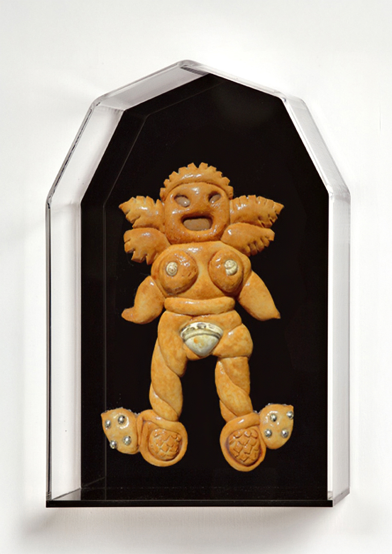 I titoli delle opere — Izanami, Nut, Loreley, Shekina — evocano figure femminili della fecondità e della trasformazione, dee e spiriti provenienti da tradizioni lontanissime tra loro. Attraverso il pane, alimento primario e universale, questi archetipi diventano presenze tangibili, sospese tra la fragilità della materia organica e la solennità del culto. Ogni scultura è un piccolo gesto di resurrezione simbolica: il pane, che biblicamente nasce per morire, viene qui sottratto alla sua fine naturale e reso duraturo, protetto, contemplabile.